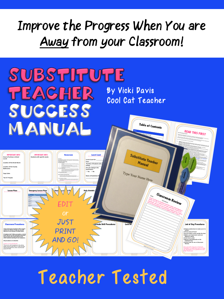 "This Substitute Manual is incredibly thorough! Ensuring that a substitute is fully prepared to take your place can make or break their day. Vicki has thought of everything in this manual, and using it will clearly set any substitute (AND YOUR STUDENTS) up for a successful experience. I have heard from many substitutes that they appreciate clear and thorough plans and information. Additionally, in working with many classroom teachers, they have struggled with what they should leave for a substitute in their absence... this manual is THE answer!" --Krista Schmidt